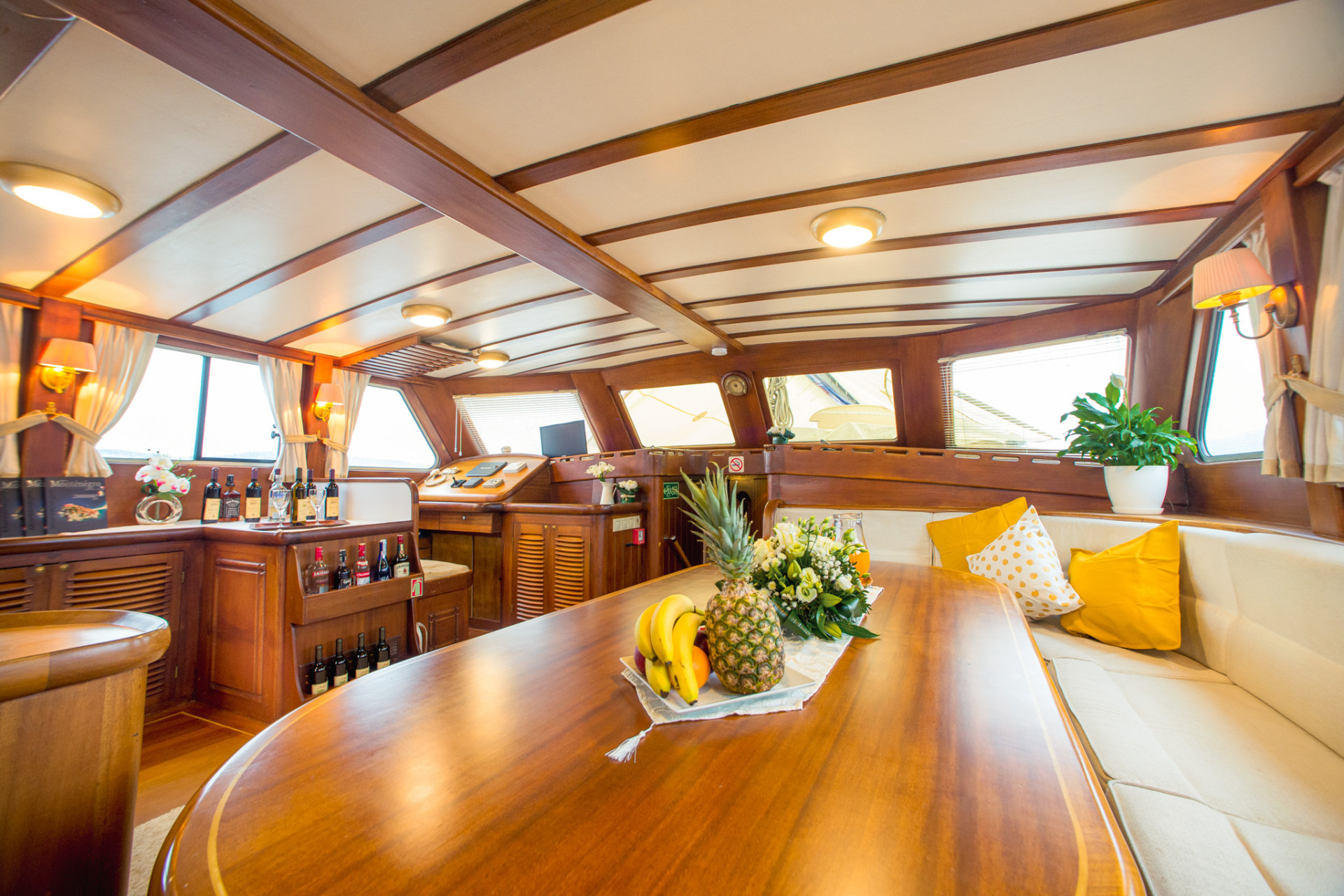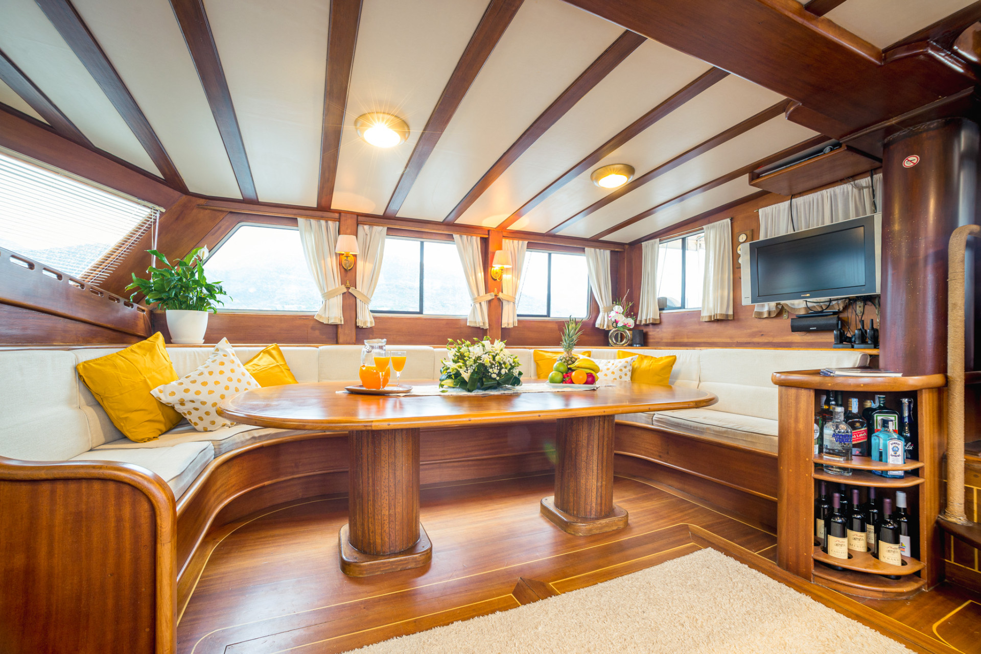 Outdoor areas are designed for social life and relaxation. The aft deck hosts a large dining table where meals are served, alongside cushioned seating areas ideal for evening gatherings. The forward deck provides ample sunbathing space with individual cushions, perfect for enjoying panoramic sea views. Interior areas typically include a welcoming salon with dining space, bar area and comfortable seating.