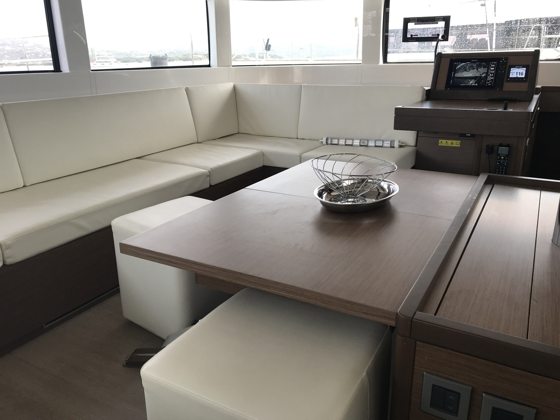 The catamaran’s layout maximizes interior and exterior living areas. The saloon offers panoramic windows and a spacious lounge connected to a fully equipped galley, creating a bright and welcoming space for dining or relaxing. Outdoor living is enhanced by a wide aft cockpit, a flybridge with a commanding view, and generous foredeck areas perfect for sunbathing or social gatherings.