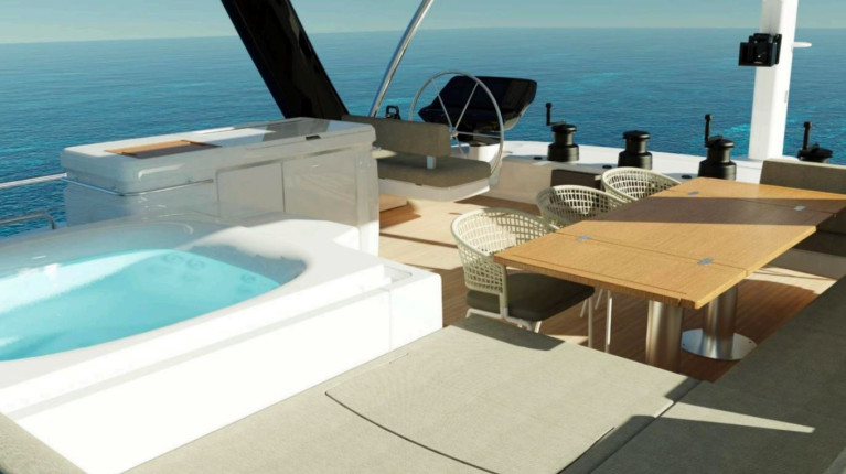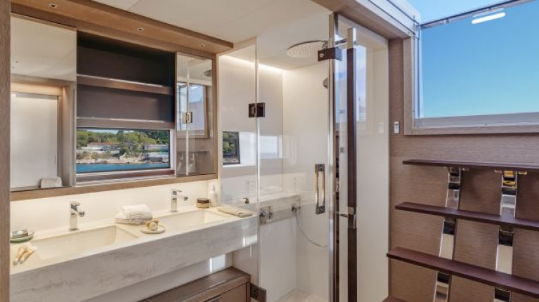 The spacious saloon, surrounded by panoramic windows, opens directly to the aft cockpit and the forward lounge, offering multiple areas for dining, relaxation and social gatherings. On the flybridge, guests can enjoy open-air lounging spaces with a wet bar, sunbeds and a Jacuzzi, creating the perfect setting for afternoon sunsets or starlit evenings.