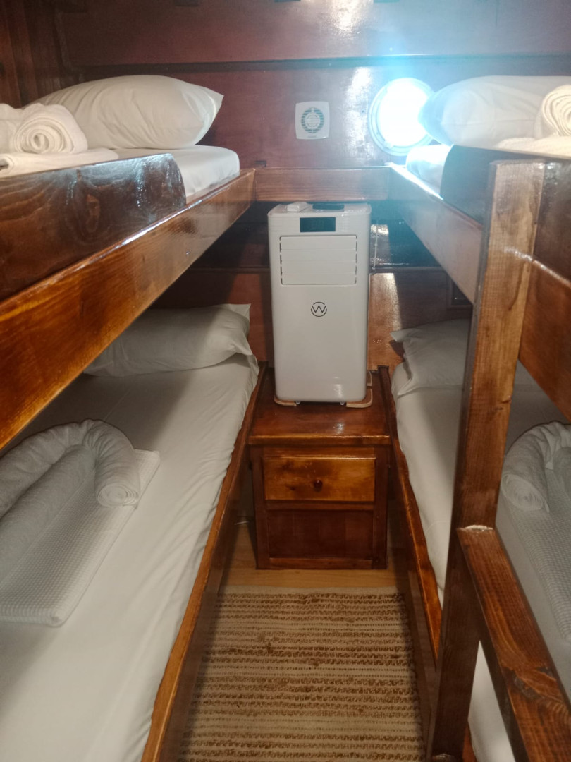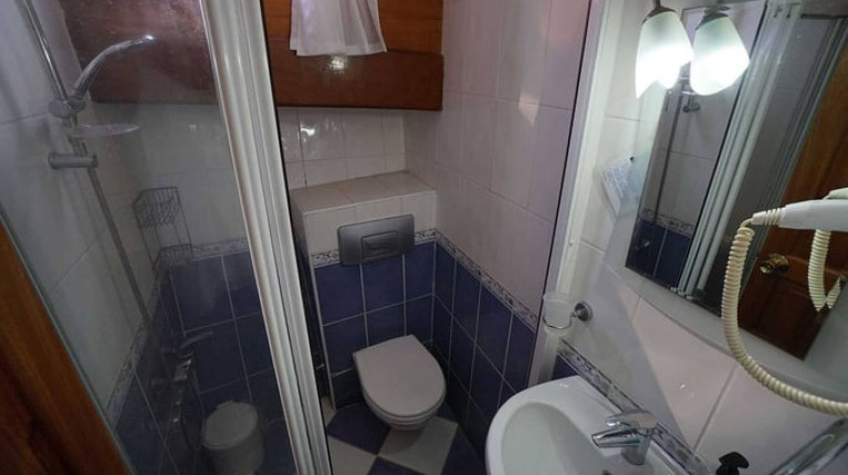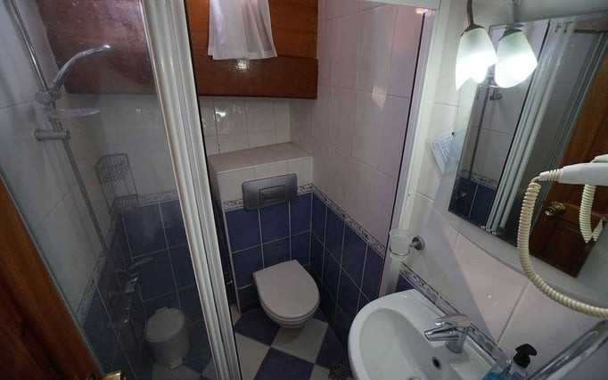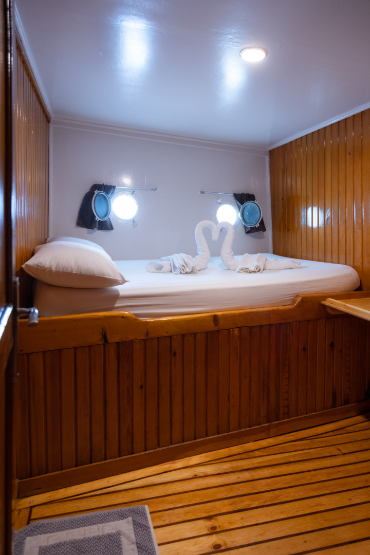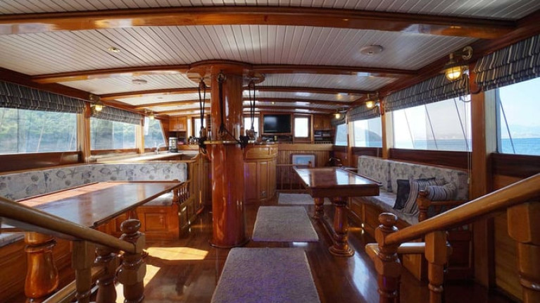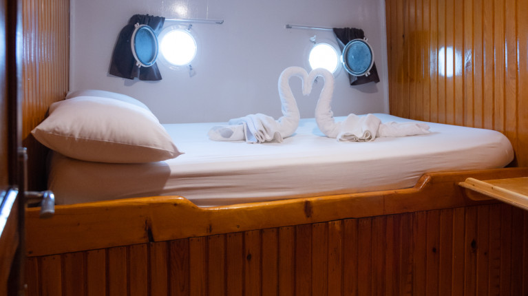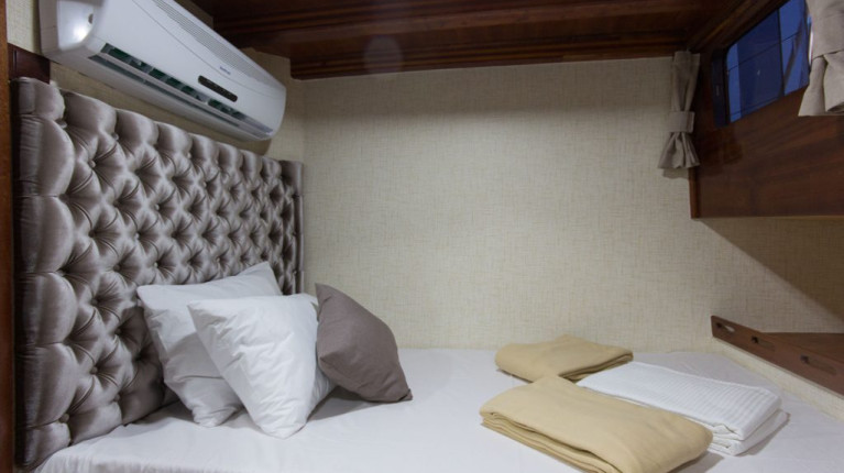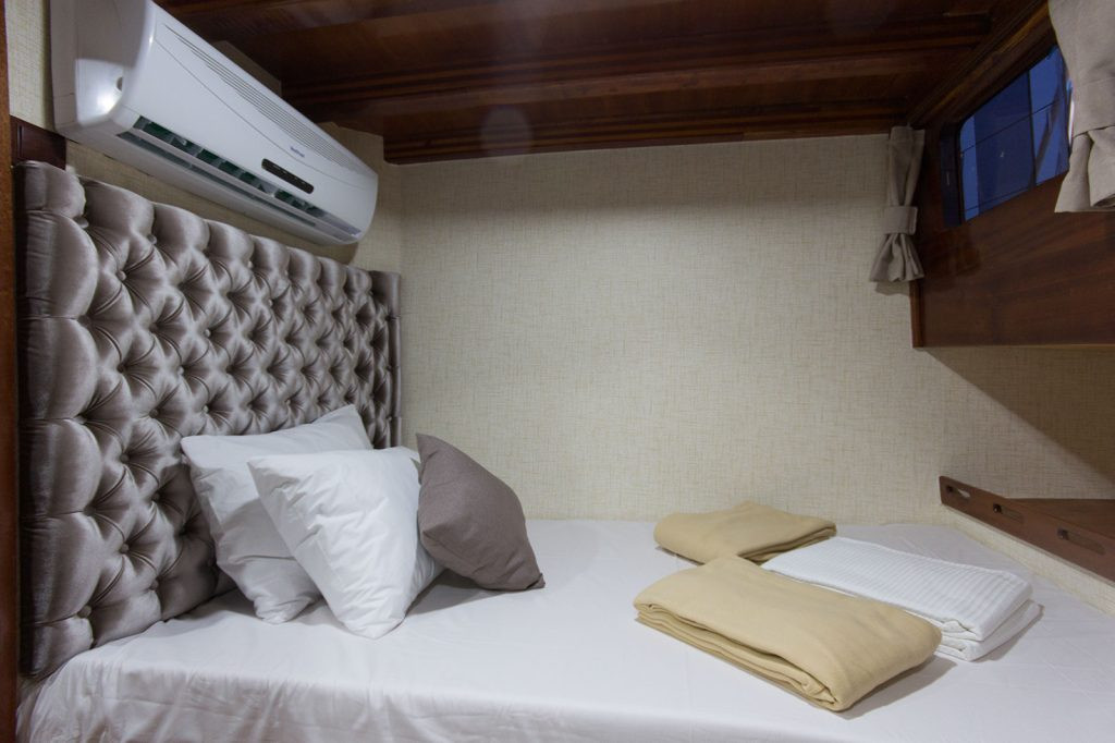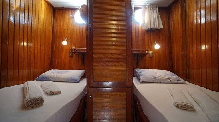 The gulets used for this cruise range between approximately 23 and 28 meters in length and accommodate small groups in private guest cabins with en-suite bathrooms. Depending on the specific yacht assigned, the layout typically includes between 7 and 9 guest cabins, designed for couples, friends or solo travelers joining a shared sailing experience. Interiors are classic and functional, with warm wooden finishes, comfortable sleeping areas and private bathrooms with shower and WC.