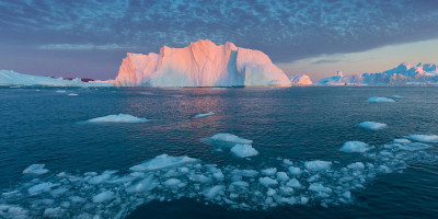 Approaching Greenland by sea feels like entering another scale of nature. Massive glaciers descend from the interior ice sheet, releasing icebergs that drift slowly through wide fjords toward the open ocean. Mountains rise directly from the water, their slopes carved by thousands of years of ice and wind.