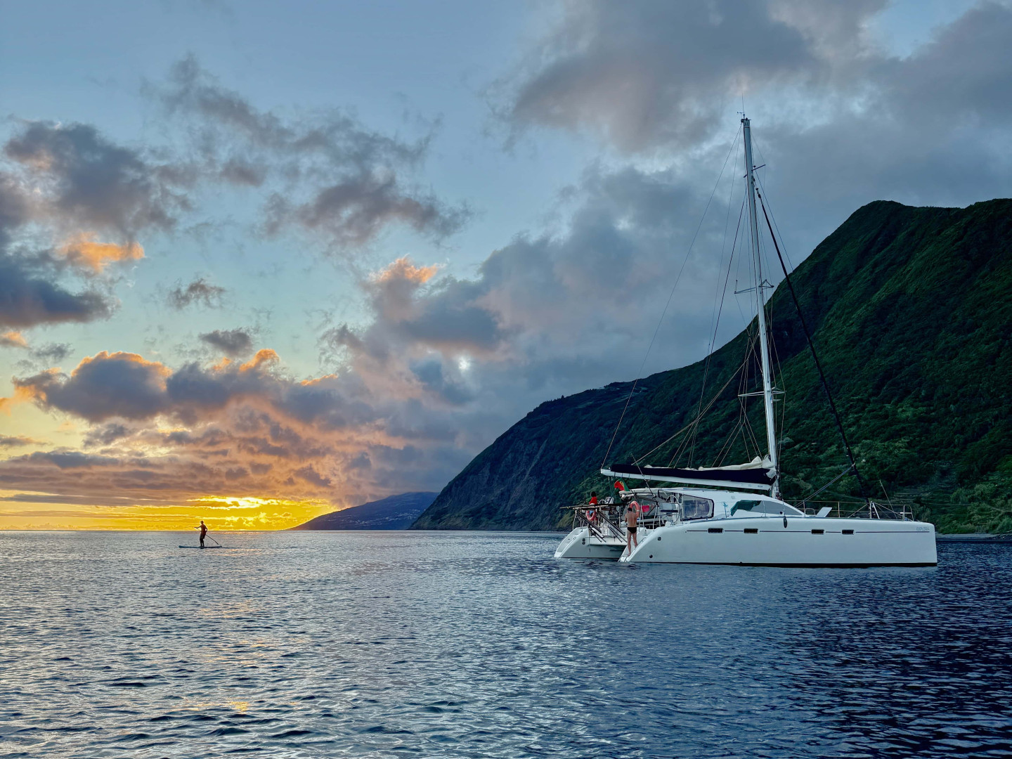 The journey begins and ends in Vila Franca do Campo on São Miguel Island, a historic harbor and traditional starting point for many Azores sailing routes. From here the catamaran sails toward Santa Maria, the southernmost island of the archipelago, known for its warmer climate, sandy beaches and dramatic coastal cliffs. Along the route there are opportunities to anchor in sheltered bays, swim in clear Atlantic waters and enjoy activities such as snorkeling, paddleboarding or coastal hikes.