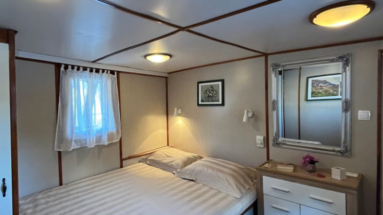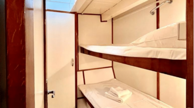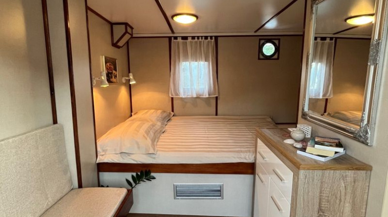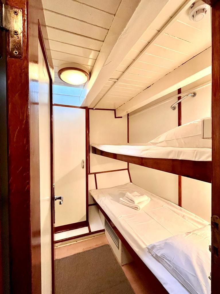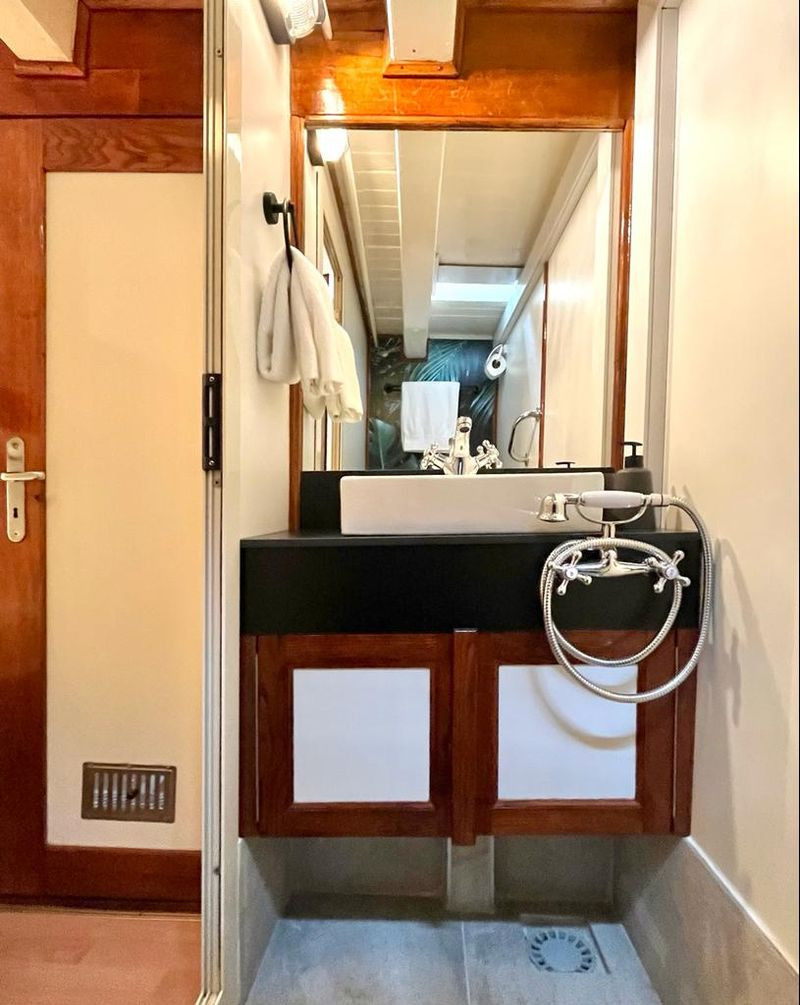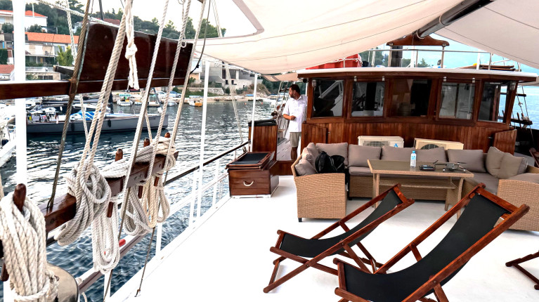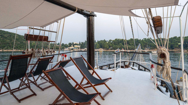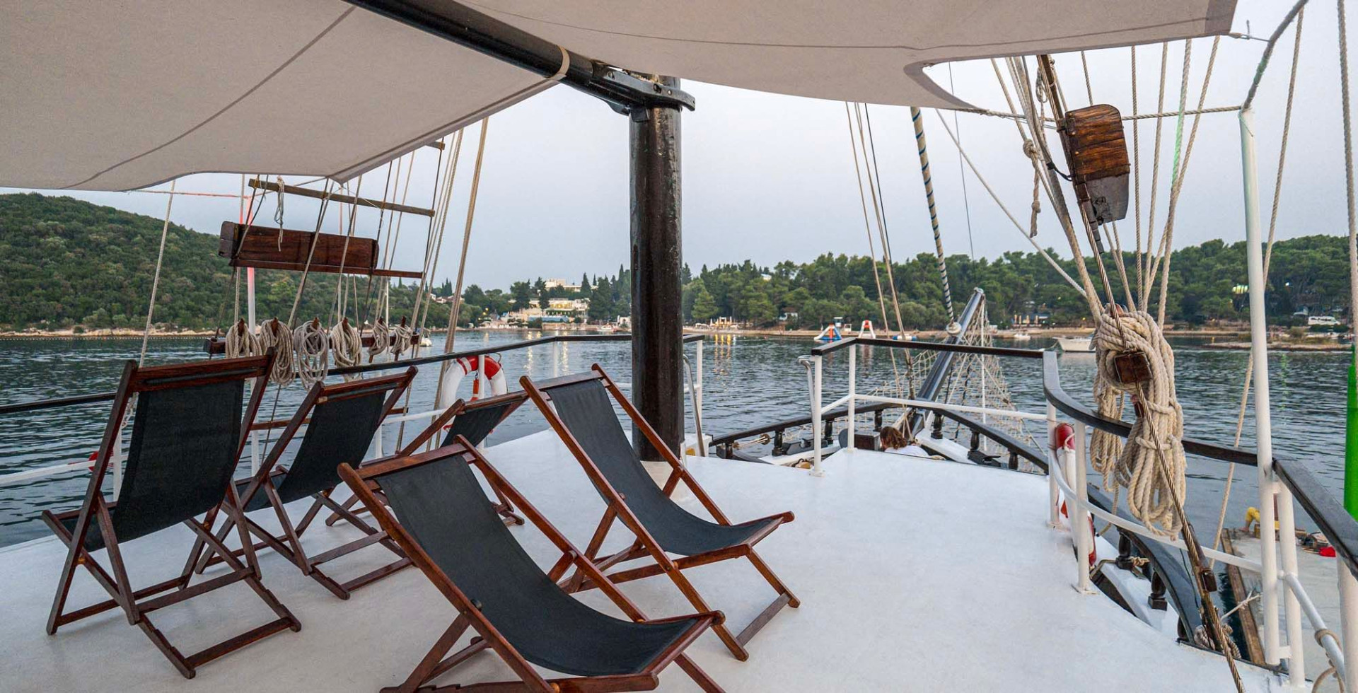 Outdoor living is equally enjoyable. The upper deck provides ample space for sunbathing and enjoying panoramic Adriatic views, while the solid hull and elegant lines reflect her origins as a true sailing vessel. She is known for stable navigation and smooth cruising performance, offering guests both the charm of traditional sailing and the comfort of a well maintained motor sailer.