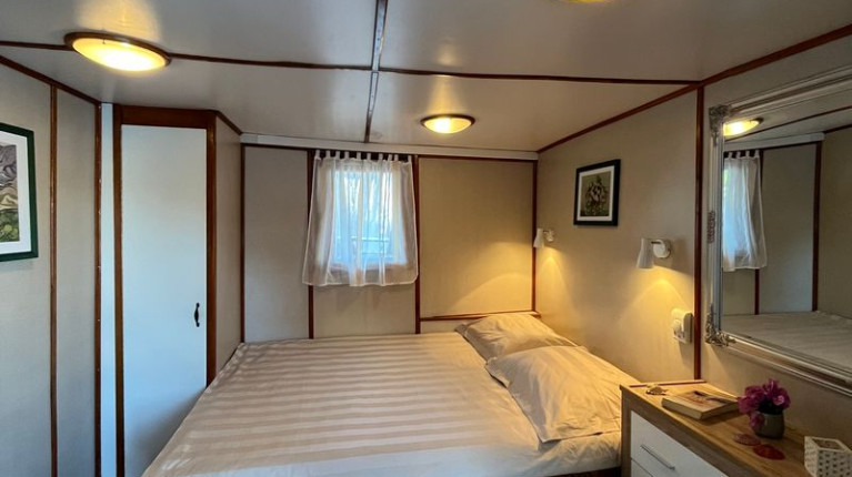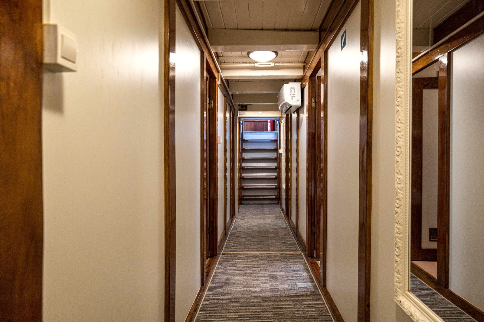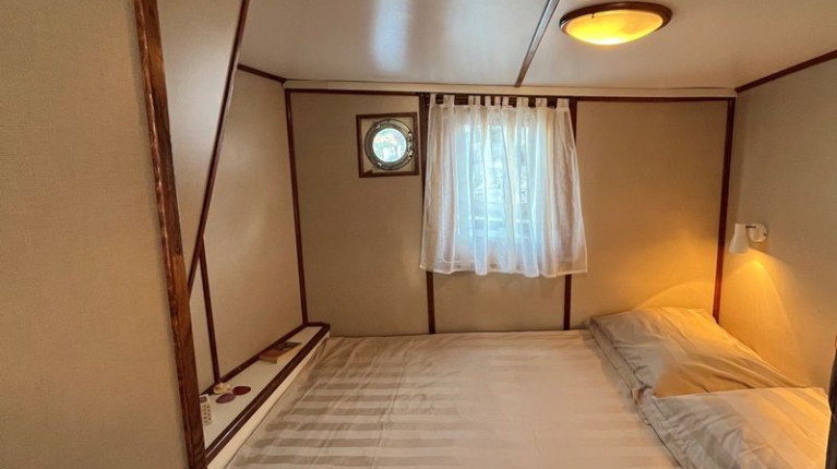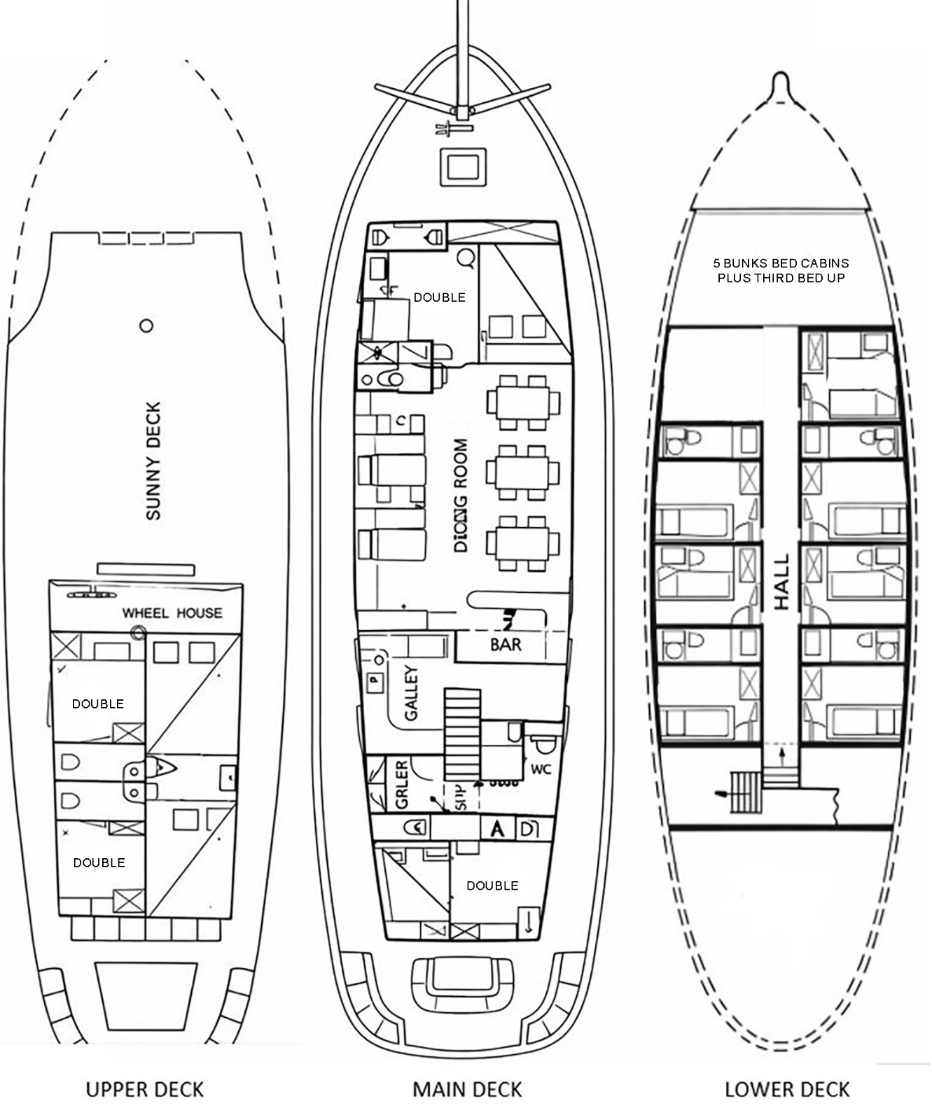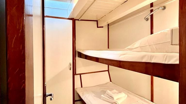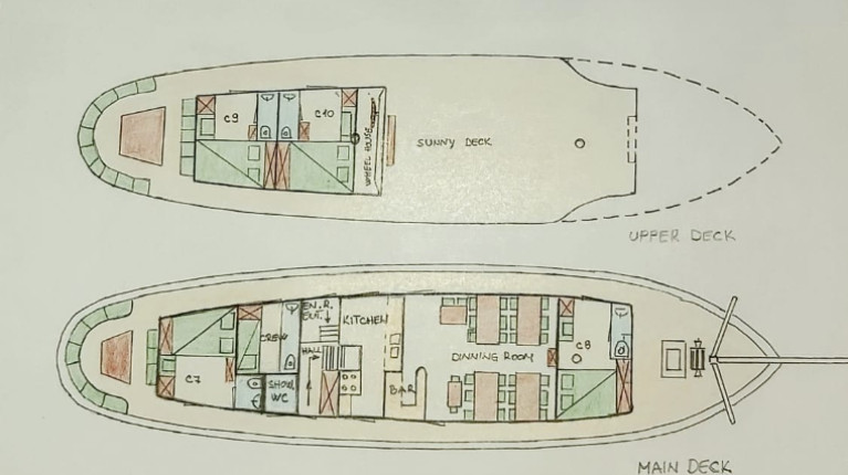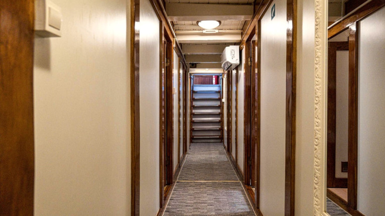 The main deck features an air conditioned indoor dining salon with bar, designed in a traditional old fashioned nautical style. The space is generous, bright and welcoming, offering a comfortable area for shared meals, social gatherings and relaxation after a day at sea.