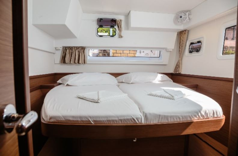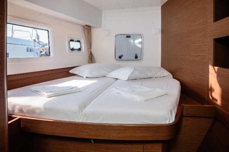 On deck, the cockpit is protected and spacious, ideal for shared meals and relaxed evenings, while the forward lounge area offers a perfect spot to unwind under sail or at sunset. The Lagoon 42’s wide beam and stable platform ensure easy movement on board and safe access to the sea for swimming and water activities.