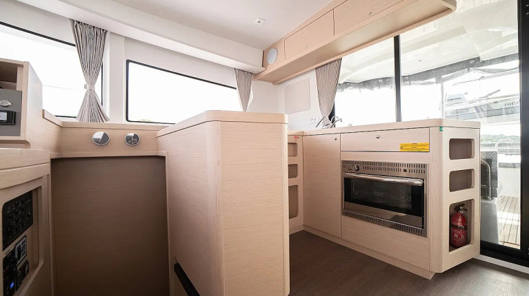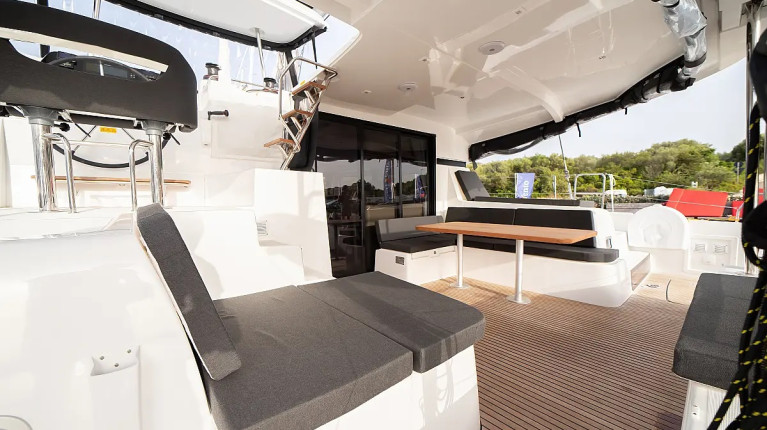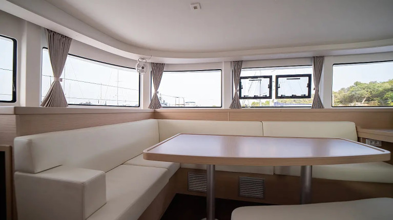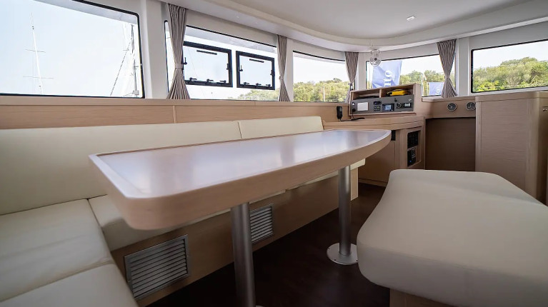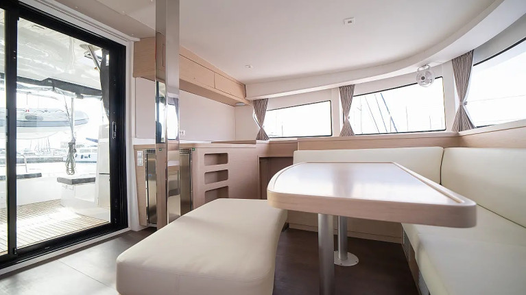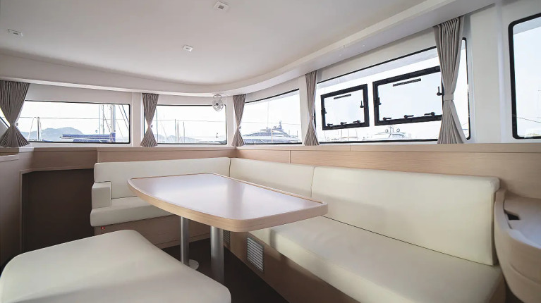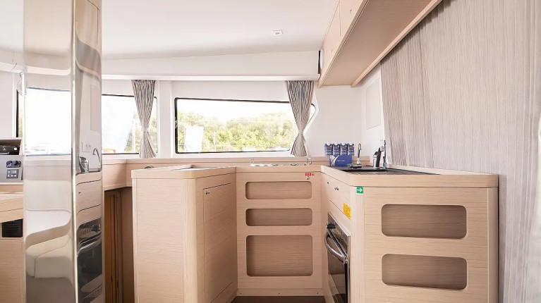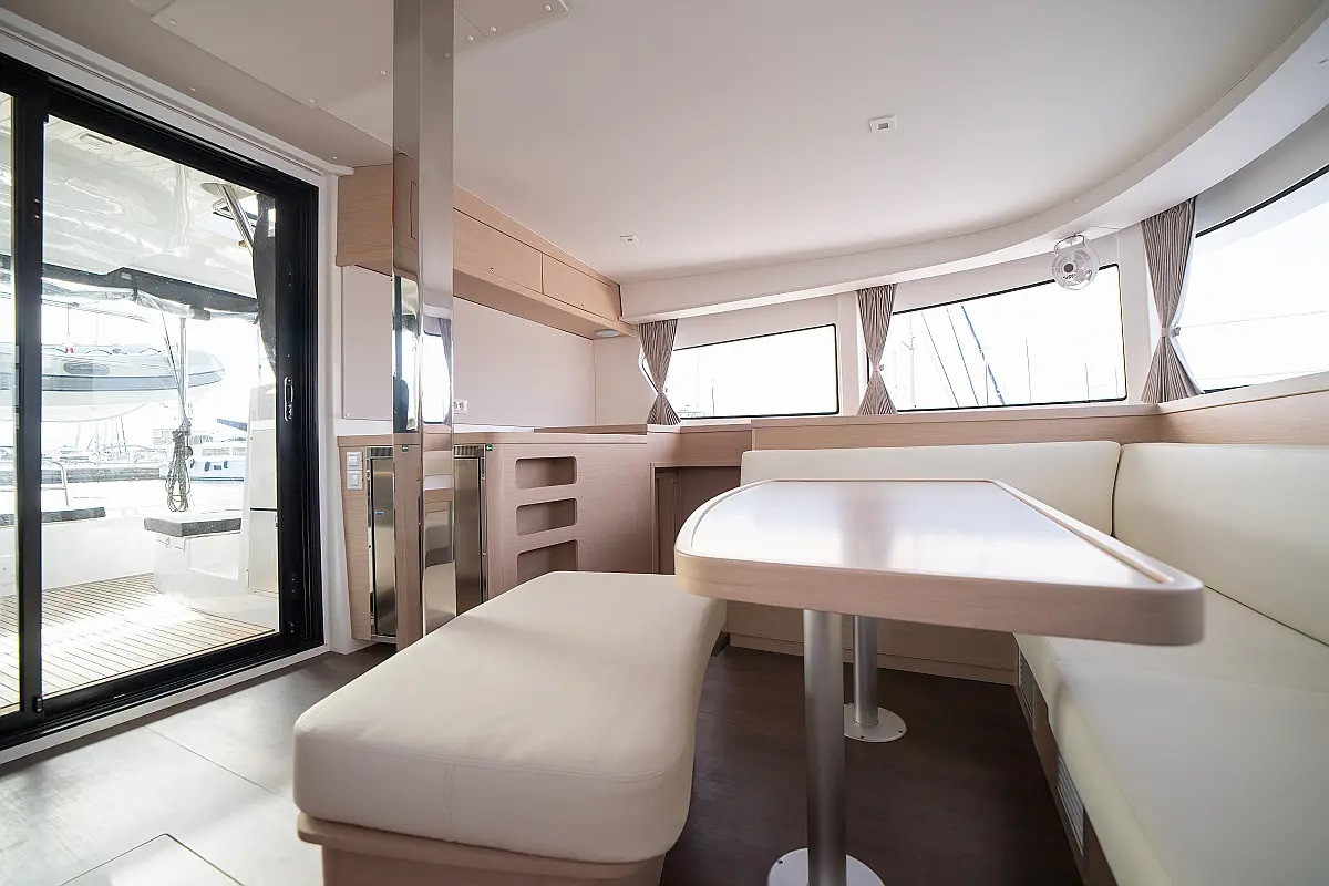 The layout typically includes 4 double guest cabins with private bathrooms, a bright panoramic saloon, and a fully equipped galley positioned to serve both indoor and outdoor living areas. Large windows, natural ventilation, and smart storage solutions make life on board comfortable throughout the day, whether sailing or at anchor.