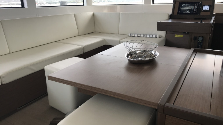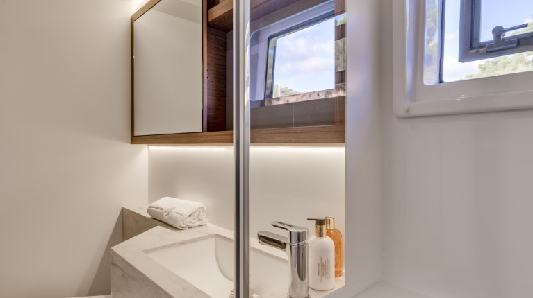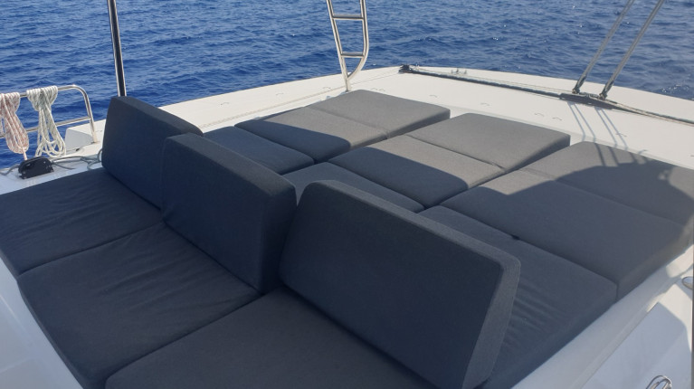 The catamaran’s layout maximizes interior and exterior living areas. The saloon offers panoramic windows and a spacious lounge connected to a fully equipped galley, creating a bright and welcoming space for dining or relaxing. Outdoor living is enhanced by a wide aft cockpit, a flybridge with a commanding view, and generous foredeck areas perfect for sunbathing or social gatherings.